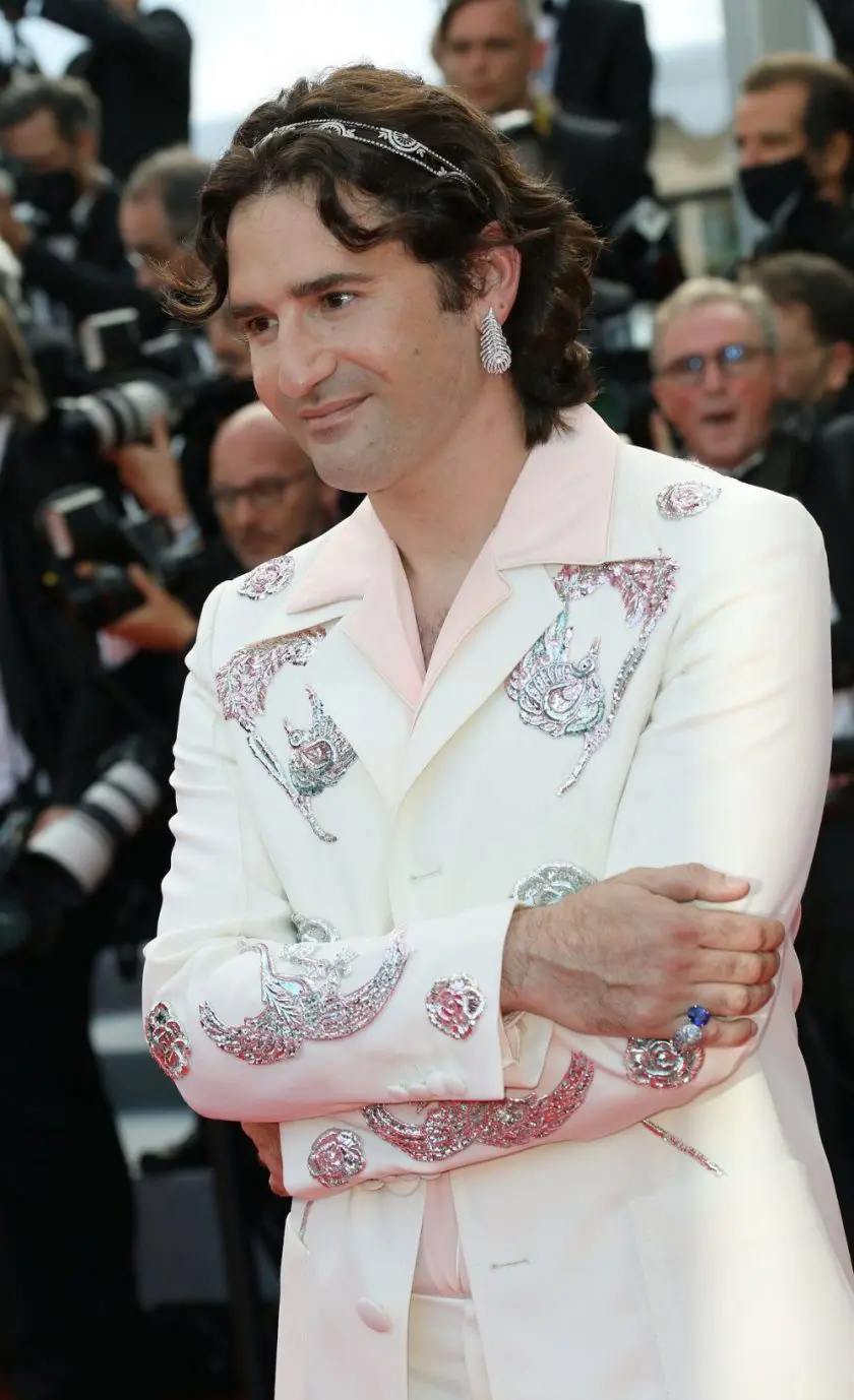 Nicolas Maury portait quant à lui la bague Meisa, la Mésange, sertie d’une tanzanite et pavée de saphirs, sur or blanc, les pendants d’oreilles Plume de Paon taille M, pavés de diamants, sur or blanc et sertis d’un diamant taille rose. Il portait également un bandeau vintage orné de sept motifs d’éventails, avec un cadre en diamants. boucheron.com