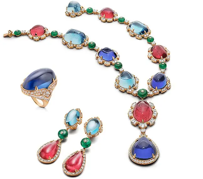 A lui seul, le collier est une invitation à un voyage autour du monde. Dessiné dans l’esprit des lignes graphiques des Jardins Farnès, il réunit 2 splendides tanzanites, des rubellites et émeraudes ainsi que des aigues-marines. Les pierres sont serties pour créer un effet chromatique fascinant pour attirer les regards.