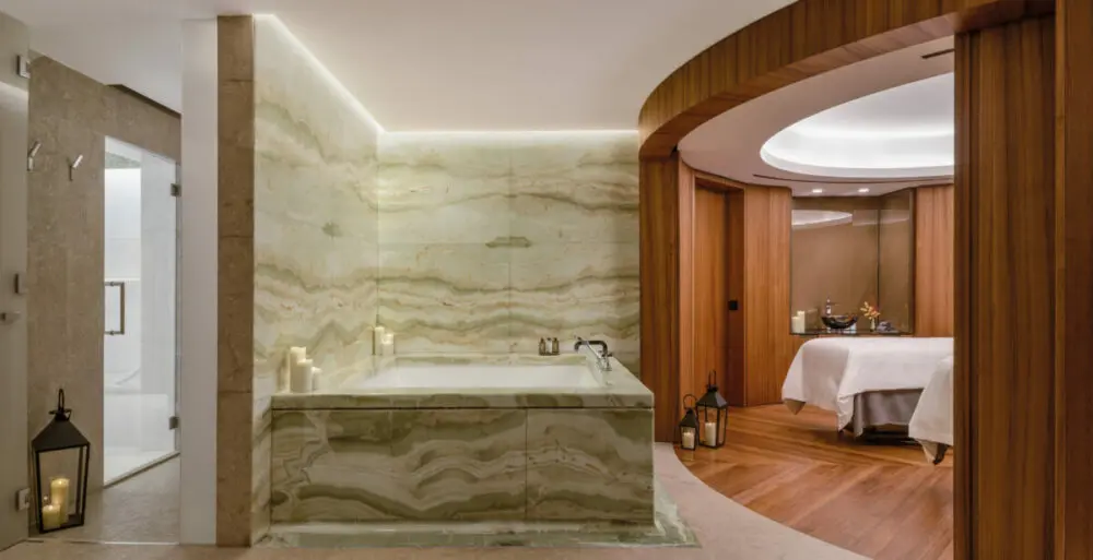 Place au Spa ! Il compte, sur 1300 m², 10 cabines de soin, dont une immense Spa suite, une piscine semi-olympique en mosaïques avec des touches d’or qui reflètent la lumière et en leitmotiv sur les colonnes, le Serpenti, motif Bvlgari. Le plus ? Une « Vitality pool », jaccuzzi des temps modernes à la façon des bains romains de Carracalla. Après ça, un petit brushing s’impose au salon Les Deux Garçons, 2 frères, figaros bien connus des parisiens.