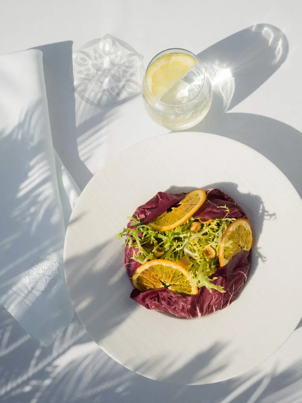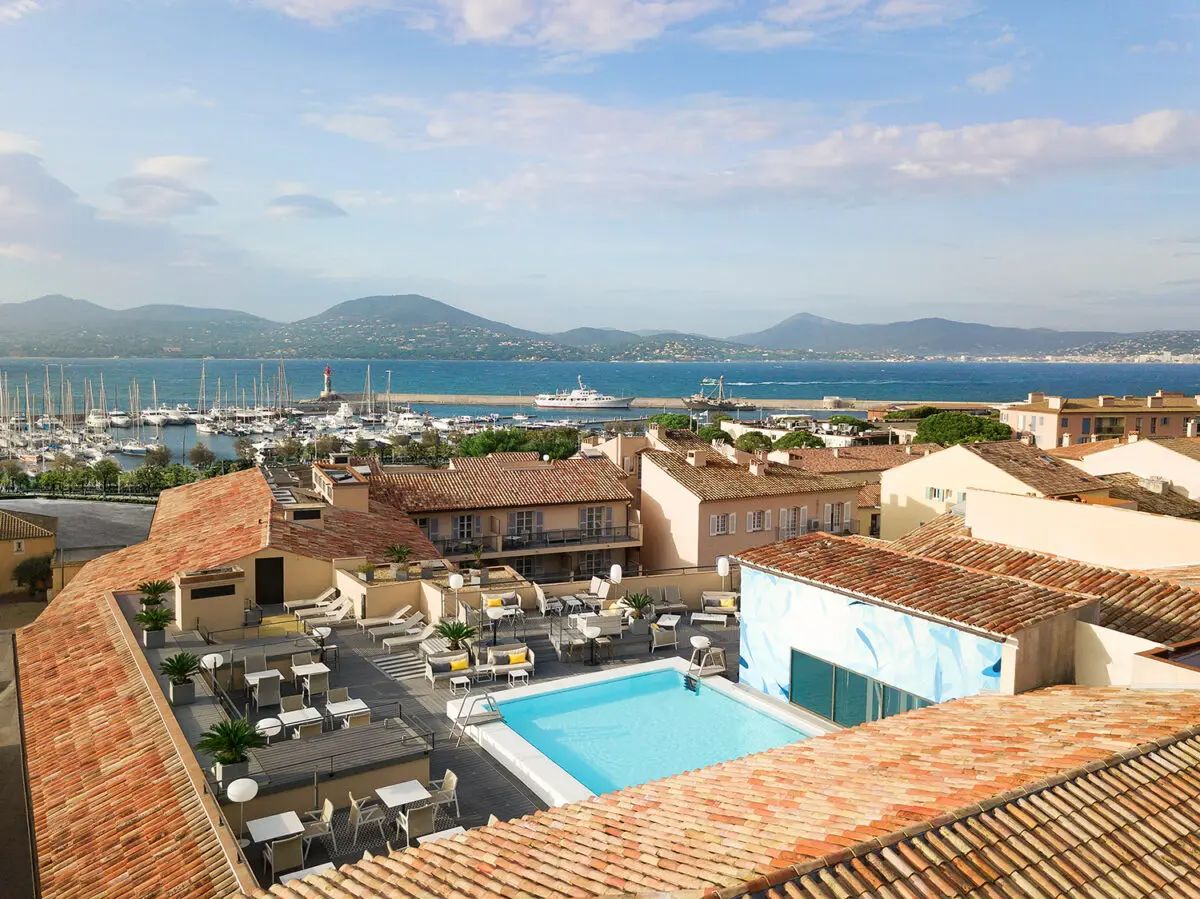 Au menu du mois de juin (qui changera en juillet-août, mais dans le même esprit), une salade croquante, mélange de chicorées, éclats de noisettes et amandes torréfiées, condiment à l’orange, suivie de noix de Saint-Jacques rôties au gingembre. Le dessert ? Un sablé gourmand chiboust citron basilic, à la fois croquant et fondant dans la bouche, mais pas dans les cuisses ! Ce qui permet d’aller d’un pied léger se baigner, dans la piscine de l’hôtel, toujours en rooftop, avec une terrasse ré-agencée et ré-haussée afin de profiter plus encore de cette vue magique. À moins de préférer l’une des nombreuses plages hypes de Pampelonne.