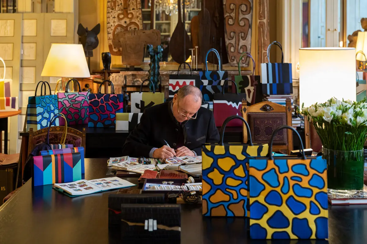 Ses cabas sont sublimes, tout en patchwork, dont Francois-Joseph Graf a dessiné les contours, les idées dans l’un de ses précieux carnets qui ne le quittent jamais. Ceci, avant d’en faire un « mood board » afin d’en extraire la substantifique mœlle de ses créations. Voyages, événements, hôtels, restaurants and so on… tout l’inspire. Sa plus grande qualité ? La curiosité. Le résultat ? Abu Dhabi, Beaubourg, Chimère, Calder, mais aussi Buvard ou Candy. Des sacs tableaux aux noms évocateurs, modèles uniques, autant que pratiques qui diffèrent tant de ce qui existe, fruits d’une personnalité très éclairée. Et qui s’expriment sans saisonnalité.