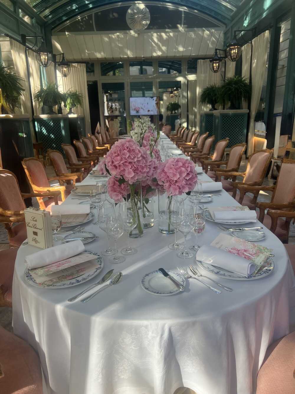 Sous la verrière du palace de la place Vendôme, des touches de rose et de vert composaient un décor raffiné, pensé comme un écrin pour Forbidden Whisper. La lumière tamisée se reflétait sur les compositions florales, tandis qu’un parfum de mystère flottait dans l’air. Lors de cette parenthèse d’exception, les invités purent échanger avec l’illustratrice qui a imaginé l’identité visuelle du flacon. Ainsi qu’avec la parfumeuse à l’origine de cette création. Ensemble, elles ont dévoilé les secrets d’une œuvre à deux voix où l’art visuel rencontre l’émotion olfactive.