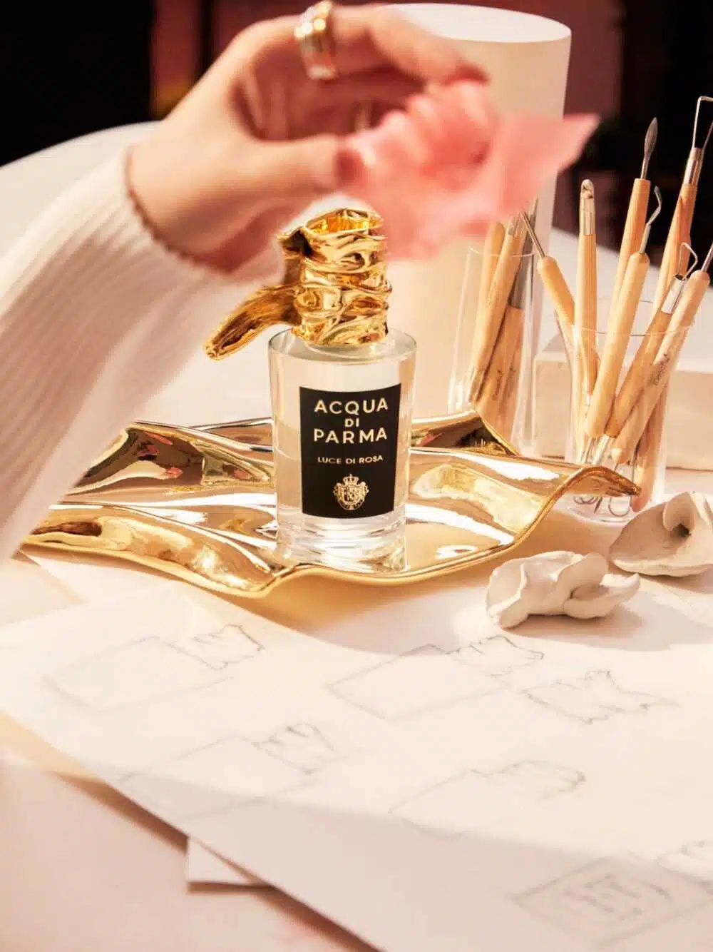 L’eau de parfum Luce di Rosa s’intègre parfaitement dans l’univers Acqua di Parma, comme un véritable « parfum-bijou ». Ce savoir-faire combine avec finesse l’artisanat traditionnel et le design contemporain. Sous la direction artistique de la créatrice de bijoux, Annelise Michelson, célèbre pour ses créations sculpturales et sa maîtrise des matières, le flacon de cette nouvelle édition devient une œuvre d’art, alliant esthétique et élégance.