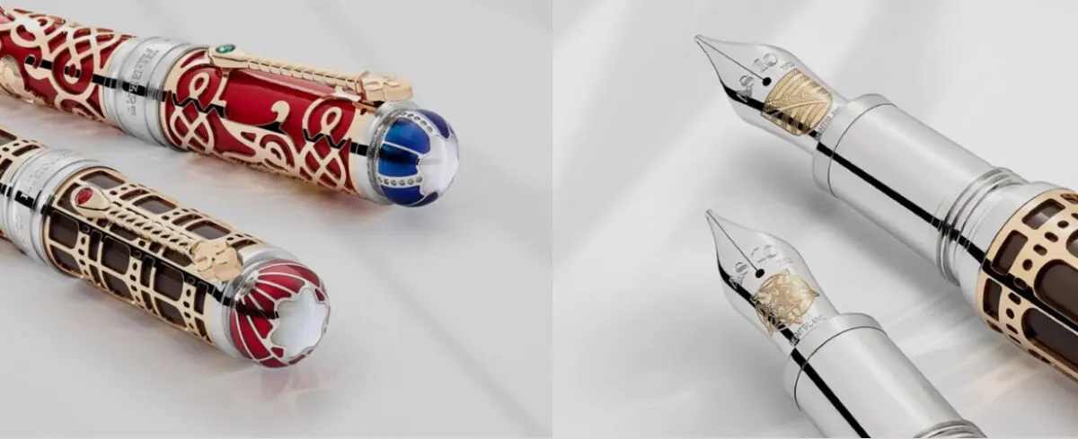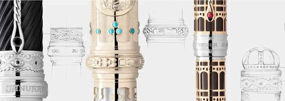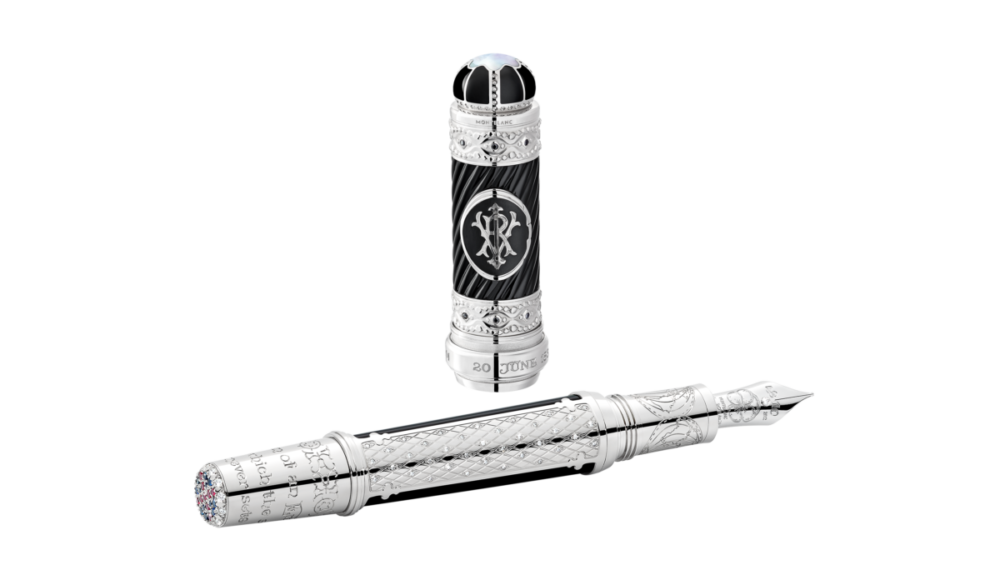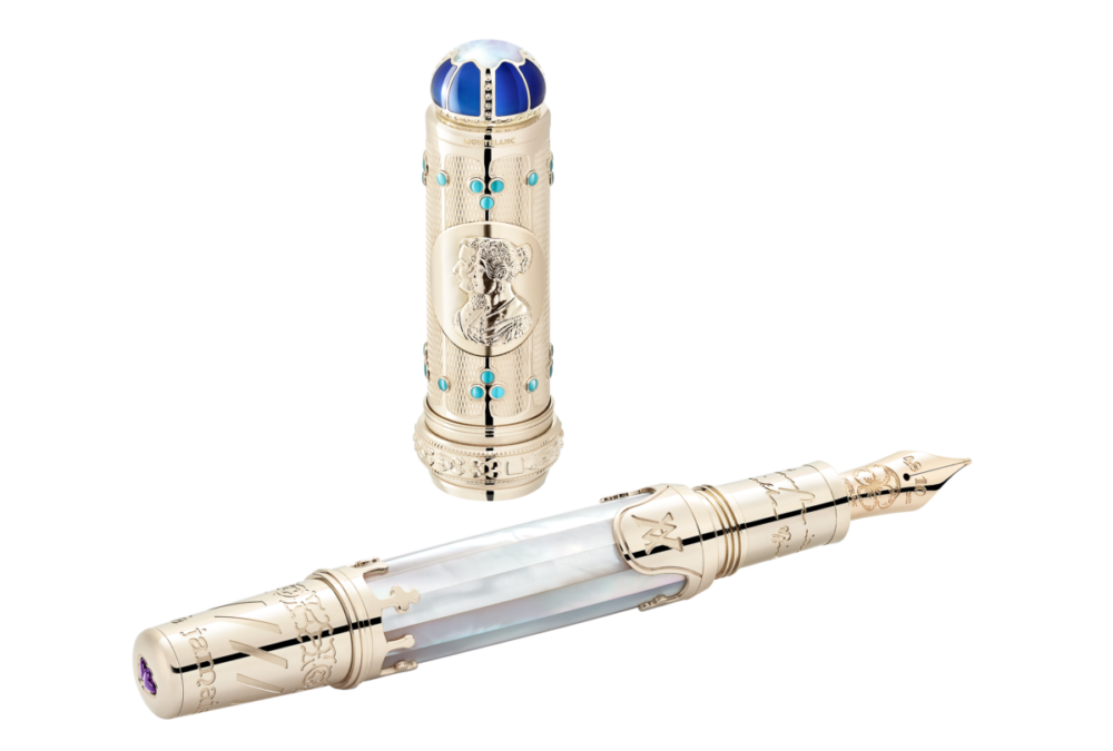 Le modèle L100 est doté de motifs relatant l’histoire de leur amour emblématique, notamment leurs fiançailles et leur mariage. Orné d’un motif guilloché inspiré par le Crystal Palace, et serti de turquoises, il est coiffé d’une petite couronne en laque bleu roi et serti d’un emblème Montblanc en nacre. L’anneau du capuchon amovible est lui, agrémenté de détails représentant des fleurs d’oranger et leurs mains jointes.