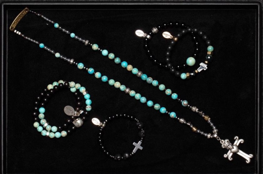 Tita Mercurio fut majordome aux USA, et chef à domicile, avant de se consacrer à sa passion : la création de bijoux à base de perles. Pas n’importe lesquelles, celles en bois de santal ou de rose des chapelets tibétains qu’elle découvrit lors d’un voyage à Katmandou. Elle les collectionne, les mélange à des pierres semi-précieuses, comme le quartz, l’améthyste et la turquoise, les marie à des têtes de mort, des croix et des madones sur des sautoirs ou des bracelets. Le tout, à porter en multi rangs.